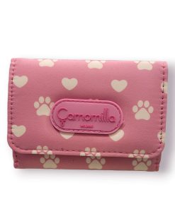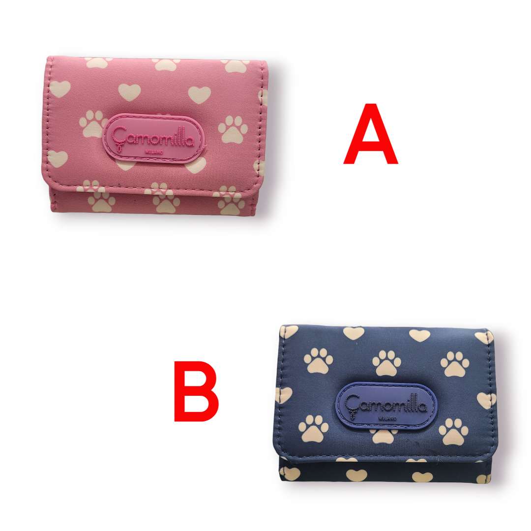 Portafoglio targato Camomilla di colore blu o rosa con la stampa di orme di gatto e cuoricini.